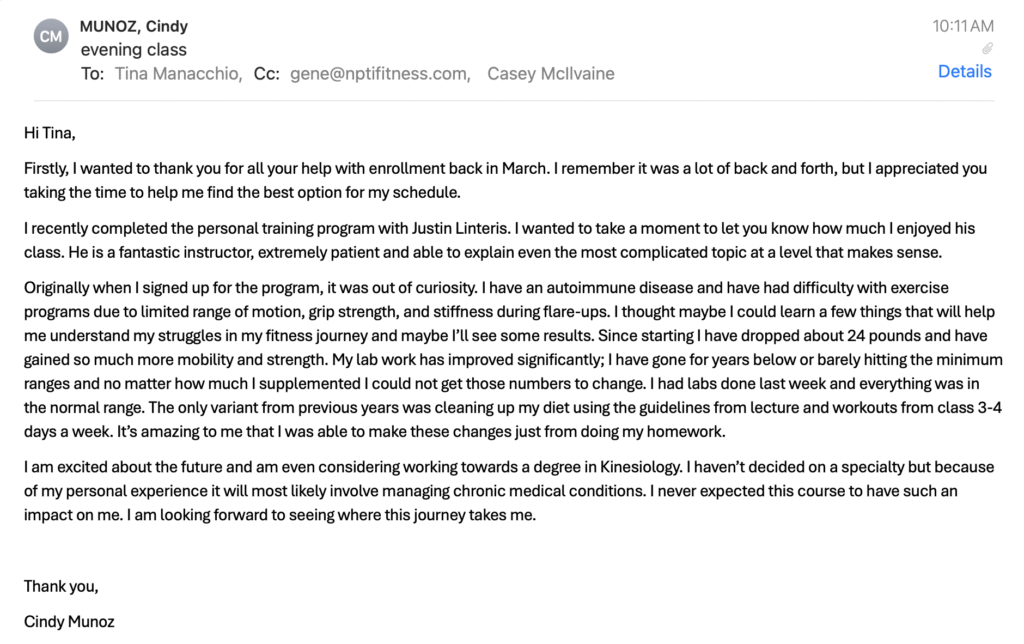 Thank you so much for all you taught me. What a wonderful program. Going to the National Personal Training Institute was such a great decision.